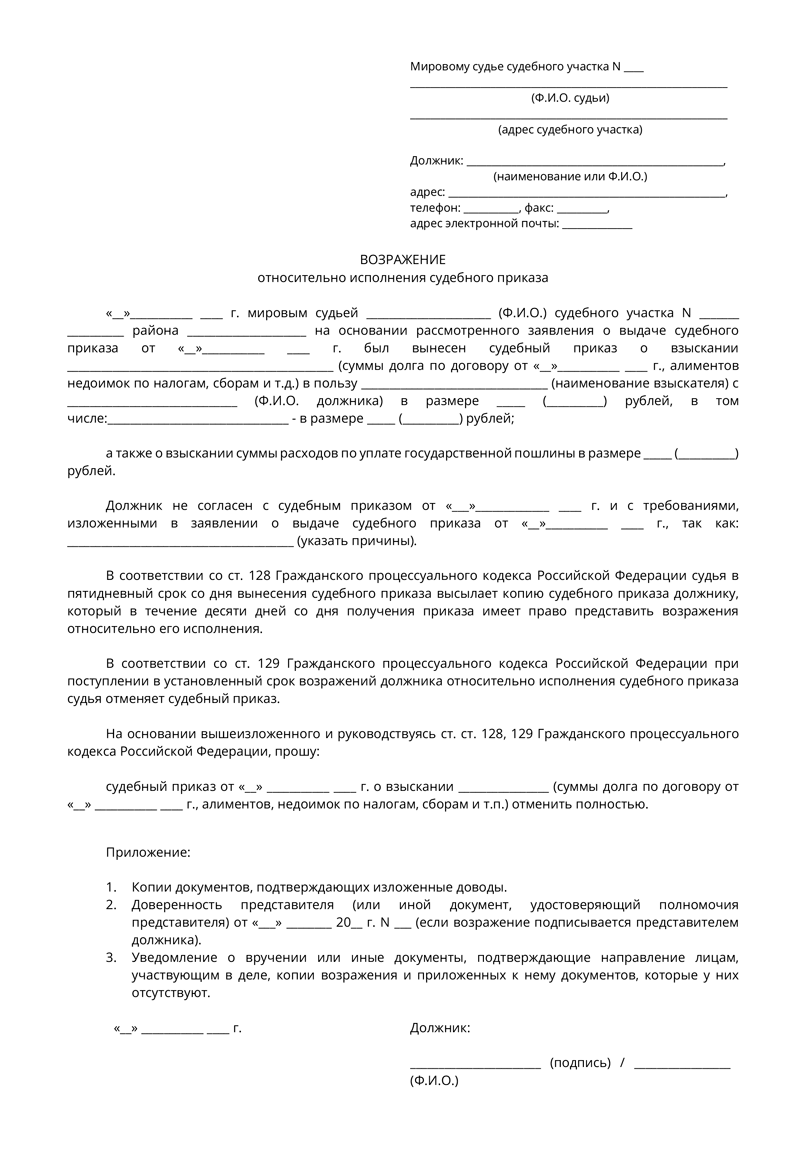 ВажноУчтите, что в соответствии с положениями статьи 129 ГПК РФ любые возражения должника являются основаниями для отмены судебного приказа о взыскании задолженности. Нарушение сроков рассмотрения заявления тоже считается весомым аргументом.